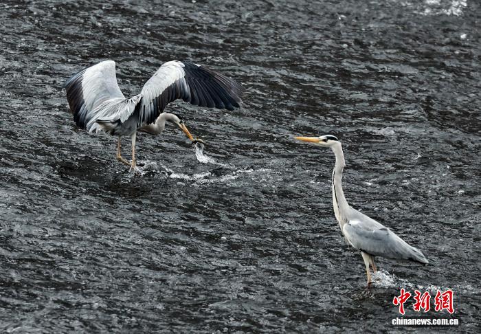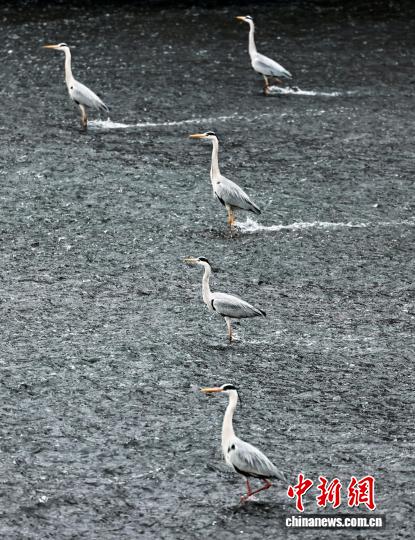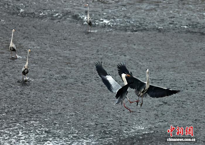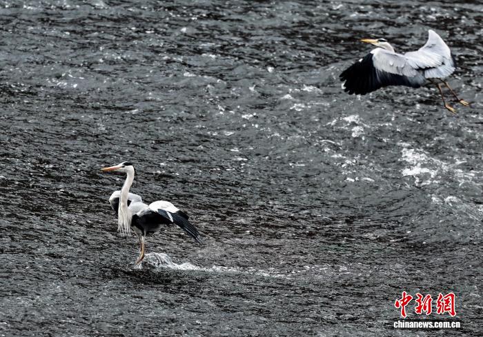 今日正在成城市9眼桥停的锦江河流,数只苍鹭顺淌偏向站坐正在浅滩处逮鱼,佳似火中“站桩”一致。中新社记者 王磊 摄
